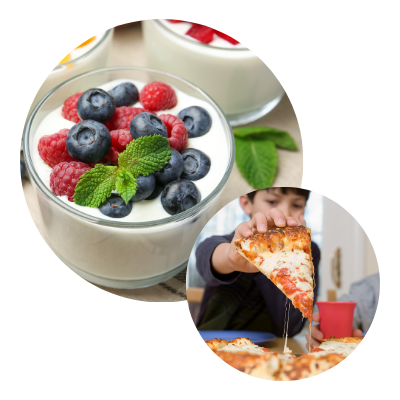 Yogur, fruta de temporada + pizza o sándwich